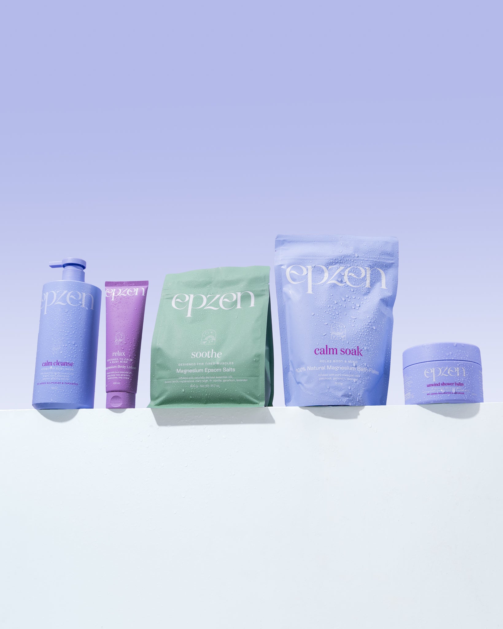 Calm Soak: Magnesium Chloride (sourced from the Dead Sea)*, Citrus Aurantium Dulcis (Sweet Orange) Peel Oil*, Lavandula Angustifolia (Lavender) Oil*, Pelargonium Graveolens (Geranium) Oil*, Pogostemon Cablin (Patchouli) Leaf Oil*, Citrus Aurantium Amara (Neroli) Flower Oil*.